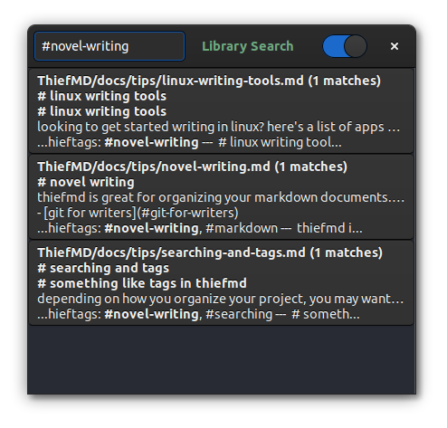 ThiefMD doesn’t have this yet, but it does have Library Search (Ctrl+Shift+F) with a live-update mode.